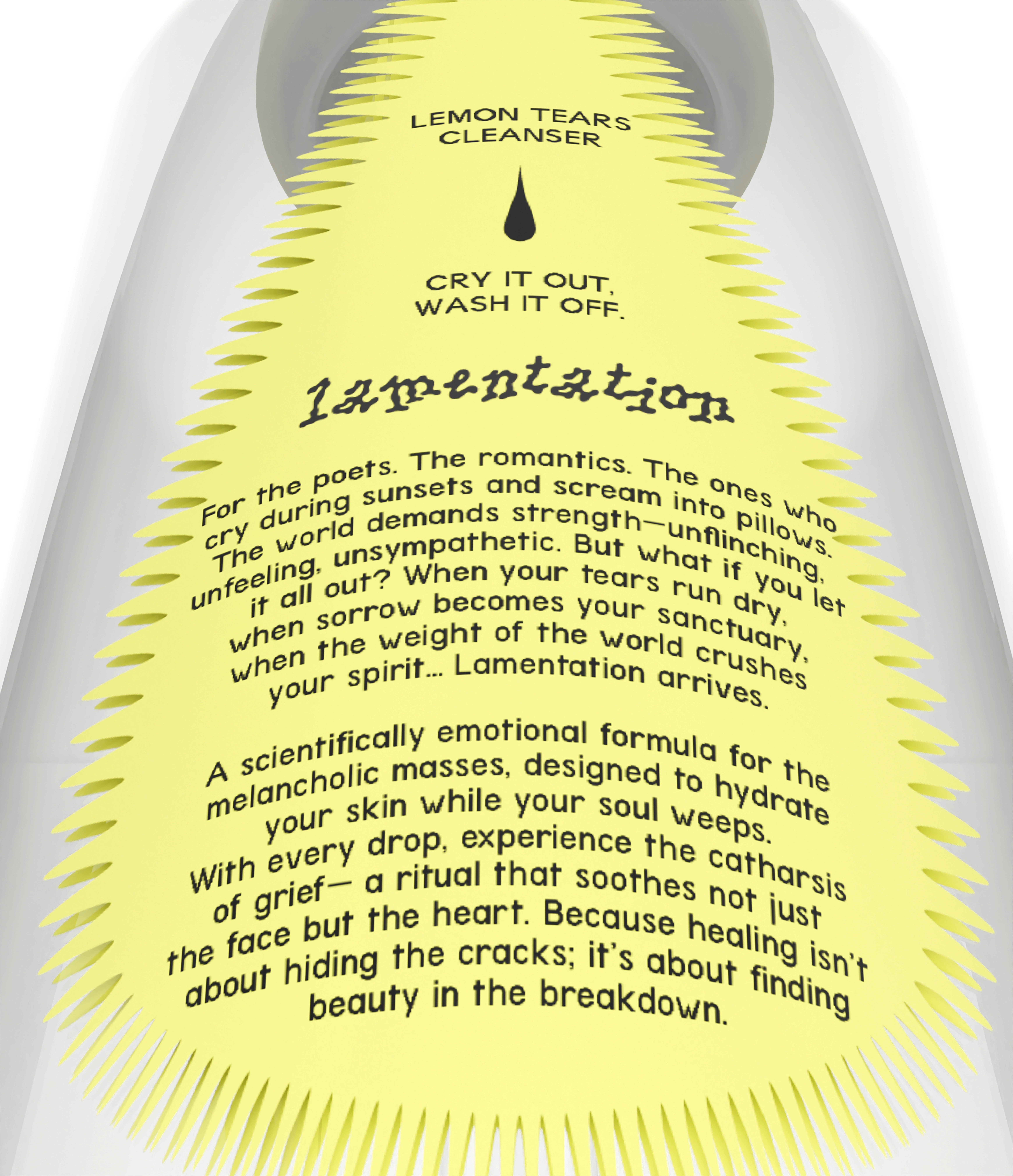 The packaging and product design draw inspiration from the act of crying itself—each drop from the serum bottle mimics the slow fall of a tear, a small but profound release. The use of lemon isn’t just a nod to the phonetic connection to “lamentation” but also a metaphor for grief—sharp, stinging, and cleansing all at once.