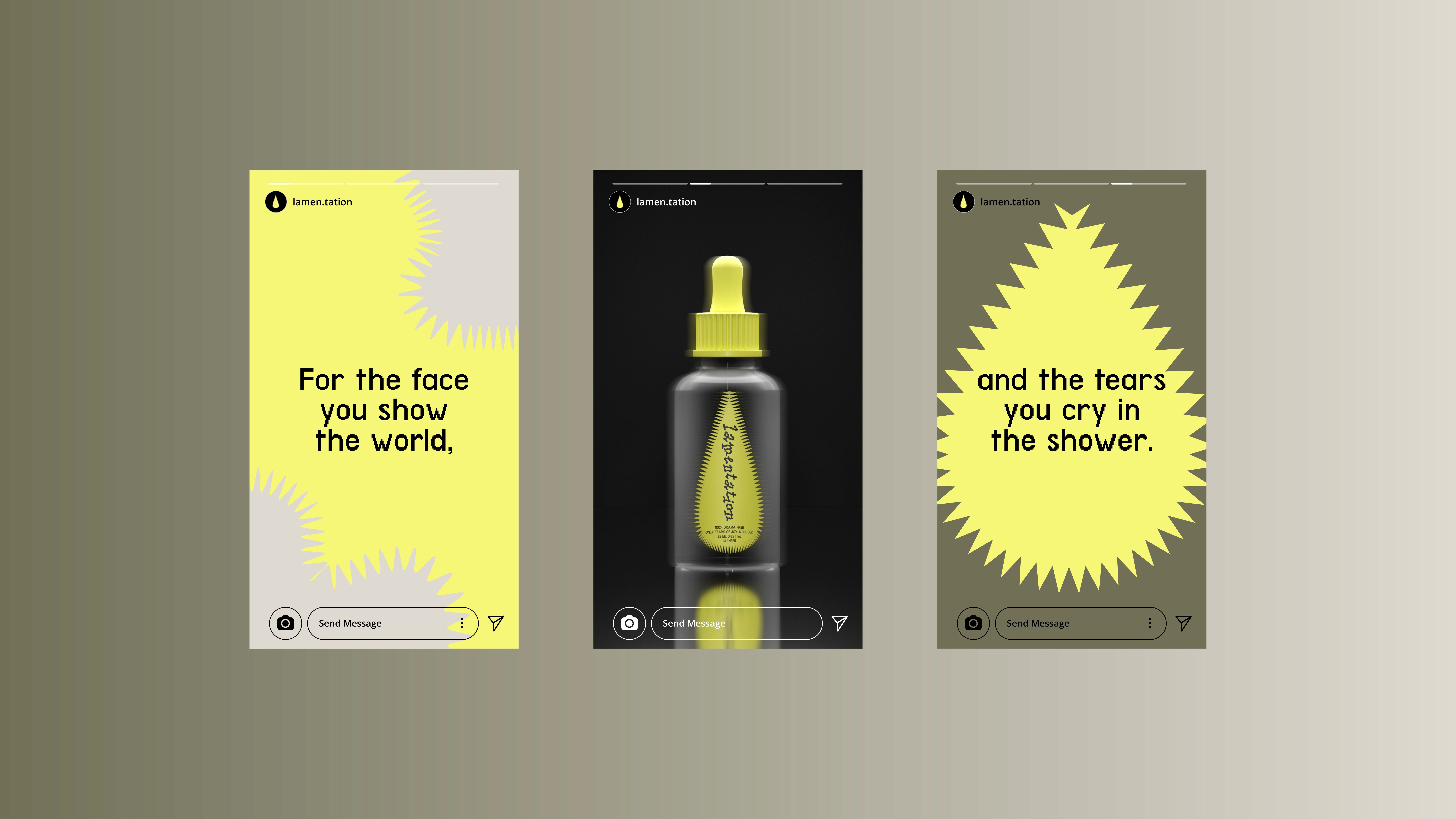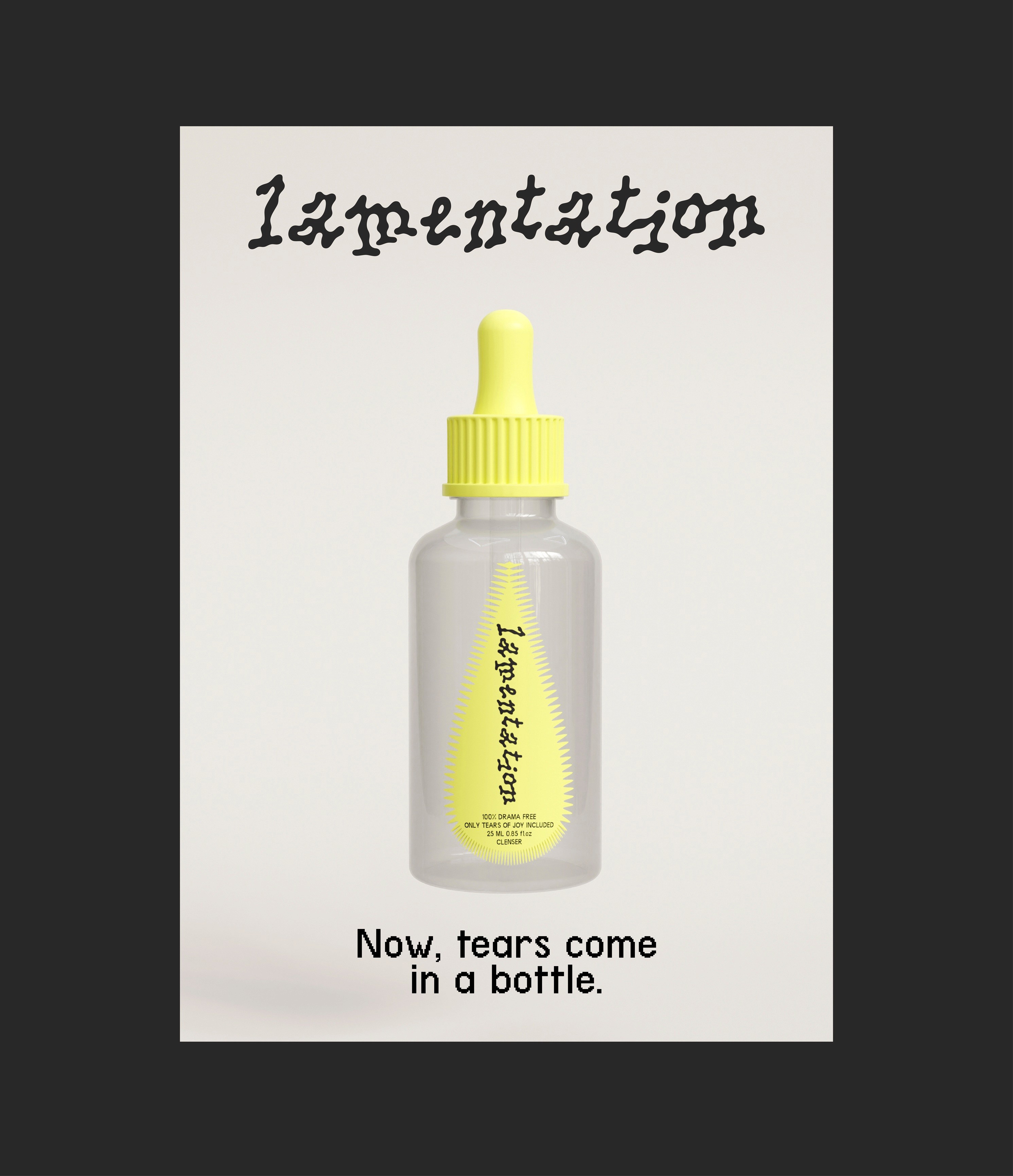 Lamentation is a self-care brand. It asks: What if grief was treated like a beauty? What if sadness had a product line? What if we packaged pain the way we package beauty? We took inspiration from the act of crying itself—a ritual as old as time, as human as breath. Each drop from a serum bottle mimics the slow fall of a tear, a small but profound release.
