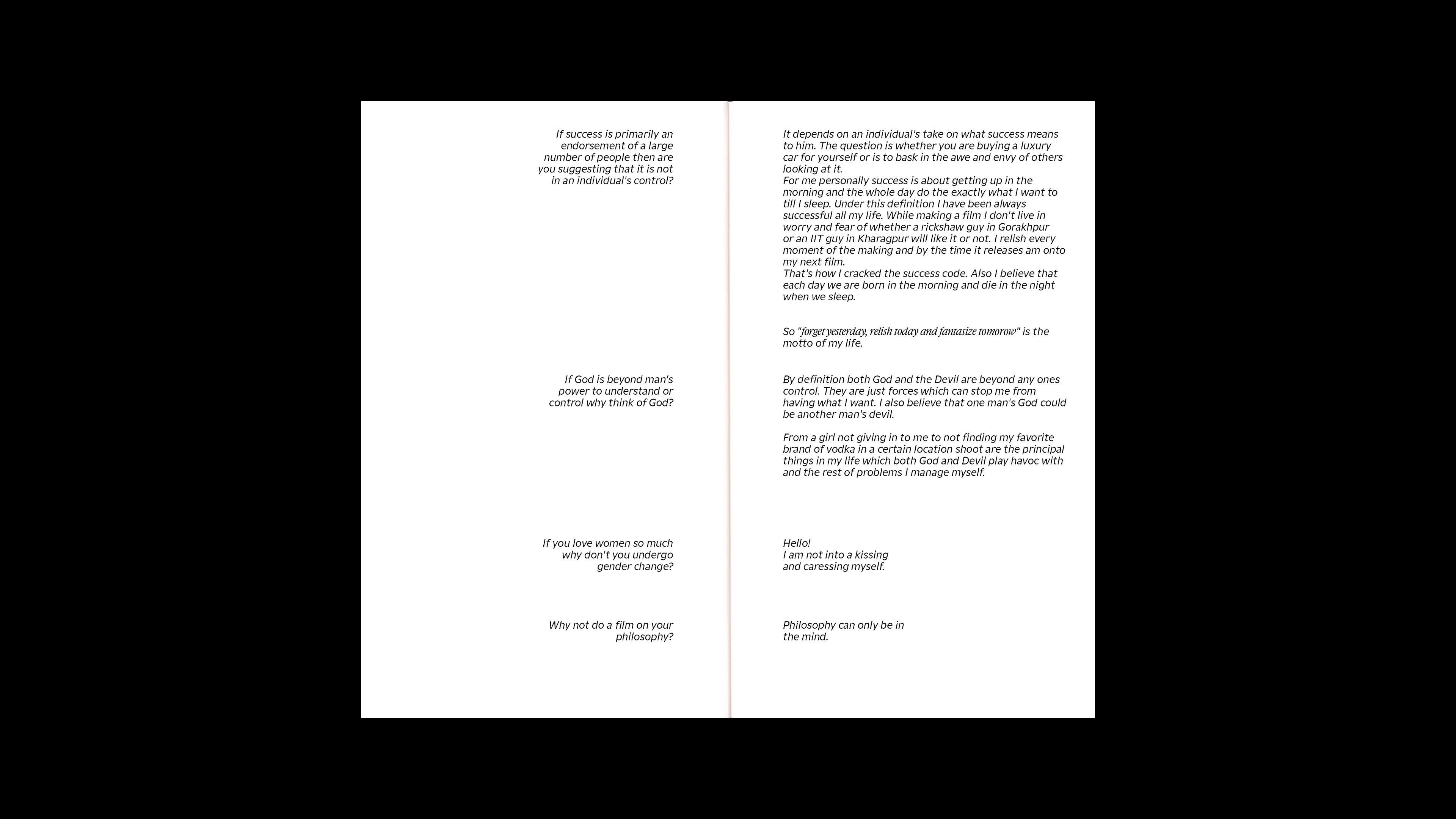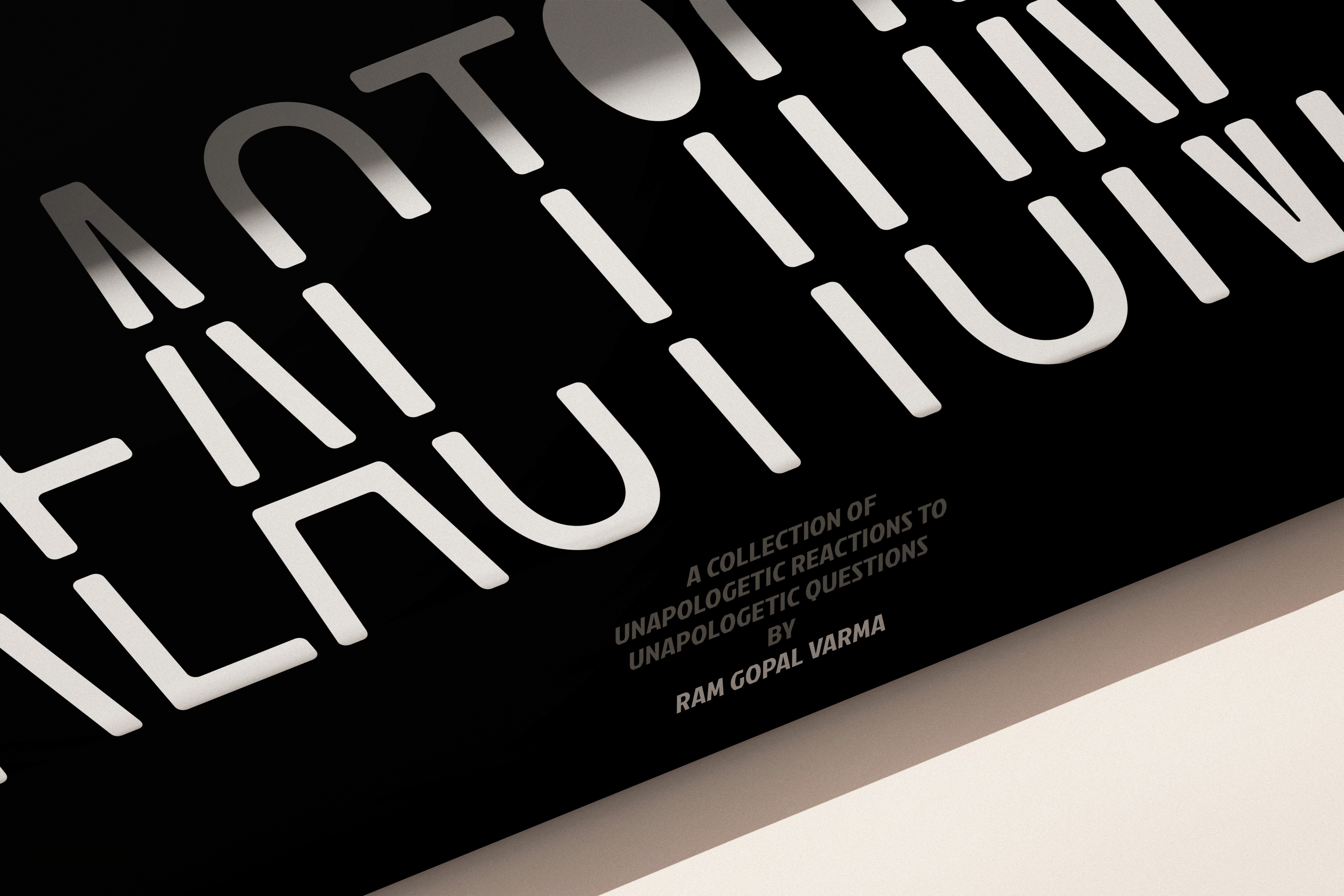 The layout concept for Reactions to Reactions draws inspiration from Rorschach art, reflecting the interplay of questions and answers. Each spread mirrors this idea, with the question on one page and RGV's unapologetic response on the opposite side, creating a dynamic dialogue.