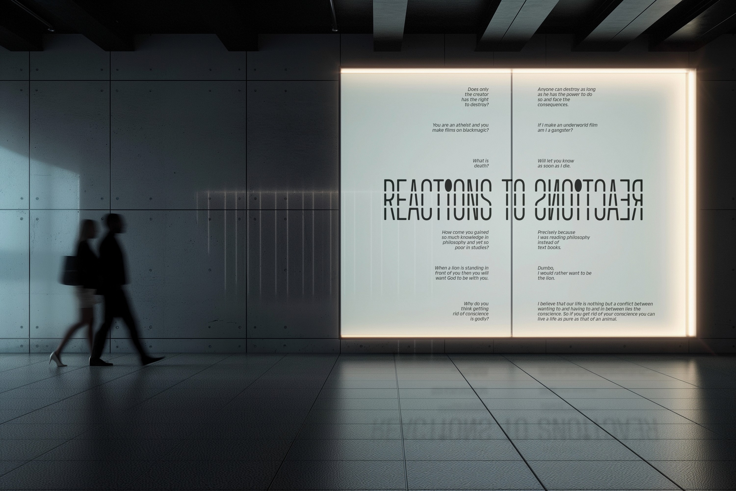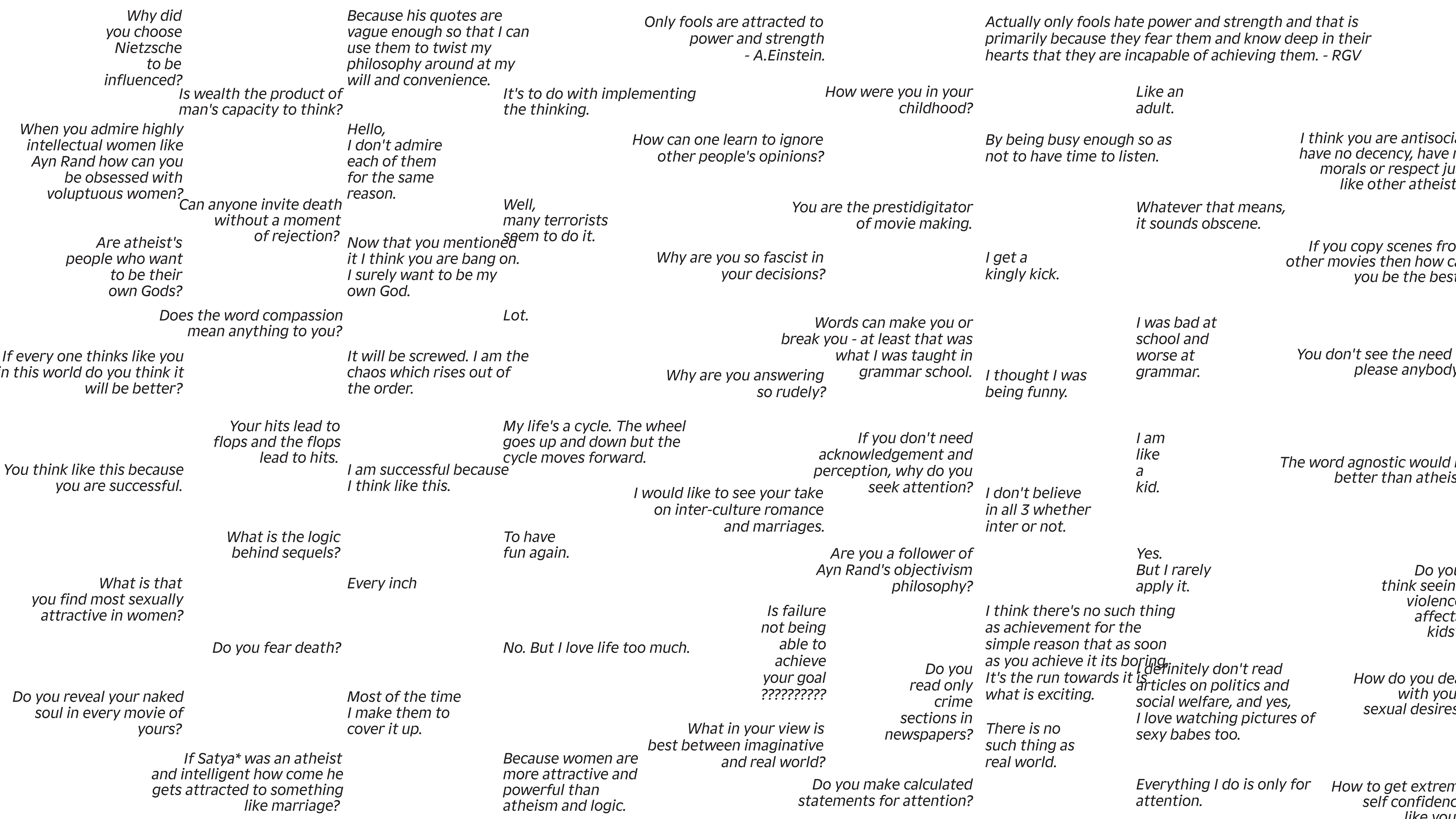 In Reactions to Reactions, design becomes a medium to echo RGV’s fearless perspectives. The project showcases the interplay of questions and answers while reflecting his individuality through innovative layouts and typography.